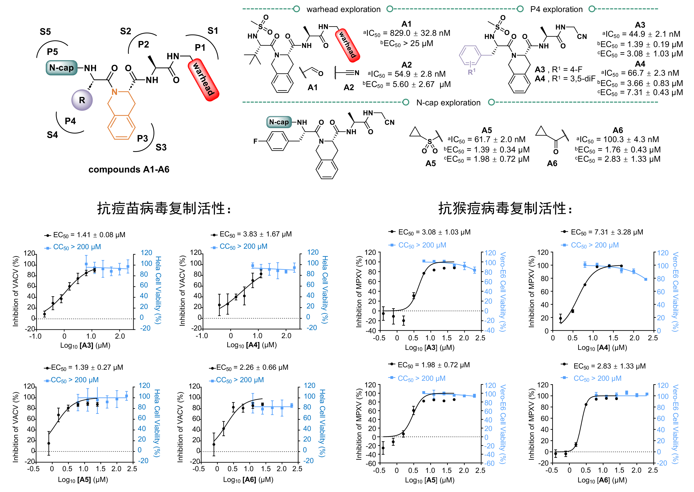 以核心蛋白酶的底物识别机制为基础,研究团队设计合成了一系列拟肽类抑制剂,其中A3-A6具有高效的病毒核心蛋白酶抑制活性(IC50范围:44.9 nM~100.3 nM),且表现出较强的抗猴痘病毒活性(EC50范围:1.98 μM~7.31 μM)和抗痘苗病毒活性(EC50范围:1.39 μM~3.66 μM),同时具有良好的安全性(CC50大于200 μM)。研究人员解析了抑制剂A3与核心蛋白酶的复合物结构,他们发现A3不仅可以与蛋白酶的催化中心的Cys328形成共价键,还可以利用其化学修饰基团同底物结合口袋的氨基酸残基形成额外的氢键相互作用,以增强其结合能力。这些研究结果表明了化合物A3-A6在后续开发广谱抗痘病毒抑制剂上的具有巨大潜力,是良好的先导化合物。