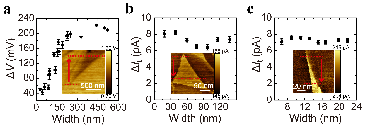 图二a. 用传统扫描电势显微镜得到moiré电势与畴的大小密切相关。b和c. 利用接触式扫描隧道显微镜方法推断moiré电势与畴的大小无关。