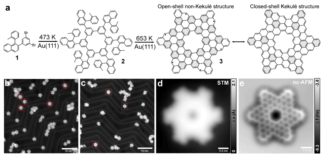 冠状化合物(Coronoids)是一类由完全融合的π共轭体系构成的大环化合物,因其独特的化学结构和电子特性而受到广泛的研究关注。为了制备出多自由基冠状化合物,九游体育(www.jiuyou.com)官方网站物质科学与技术学院于平课题组、甄家劲课题组与合作者从合成开壳纳米石墨烯的进展中汲取灵感,将三角形锯齿形分子整合到冠状分子框架中,成功制备出具有六个未配对电子的开壳纳米石墨烯结构(图1)。研究成果发表于国际学术期刊《美国化学会志》(Journal of the American Chemical Society, JACS)。