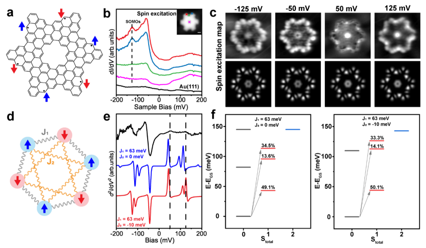 研究团队利用扫描隧道谱(STS)研究冠状分子的电子结构与自旋性质。如图2所示,冠状石墨烯dI/dV谱在-1240和1880 mV处呈现对应多个占据态H1和未占据态L1的电子态,而-125和860mV的电子态来源于分子的单占据和单未占据分子轨道(SOMO和SUMO)。团队引用平均场(MFH)模型计算得到分子轨道态密度分布,计算结果与对应能量下扫描的dI/dV图高度吻合,进一步证实了电子态的轨道来源。