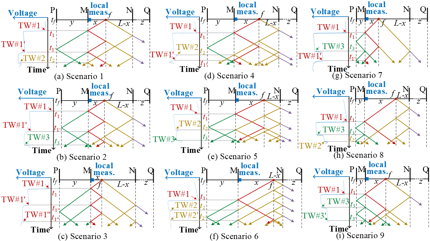 复杂的运行环境使得输电线路在正常运行过程中时常发生故障。在故障发生后,准确的故障定位对保证供电可靠性、减少停电时间有重要意义。行波法是线路故障定位的常见方法之一。然而,负载条件、气象因素以及输电线路类型的差异,都会使输电线路中故障行波的波速存在不确定性,进而影响行波定位精度。针对此,刘宇课题组提出了一种基于故障行波的单端无需波速故障定位方法。首先,针对不同输电系统拓扑和故障位置,对所有可能的行波传播路径进行了全面分析,并将其划分为9种典型情形(如下图所示);再通过行波到达本端的一系列波头极性与到达时刻,确定行波所对应的传播路径,并据此消去未知行波波速,得出故障位置的解析表达式。该方法对不同的线路类型与系统拓扑均表现出较强的适用性。与现有的故障定位方法相比,新方法仅基于本地测量值,在行波波速不确定时表现出较高的故障定位精度。