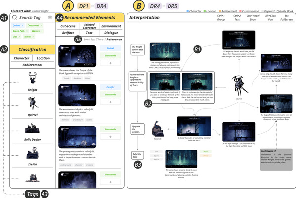 图2. ClueCart界面。(A)左侧面板用于线索分类与检索。(B)右侧面板用于故事解读。
