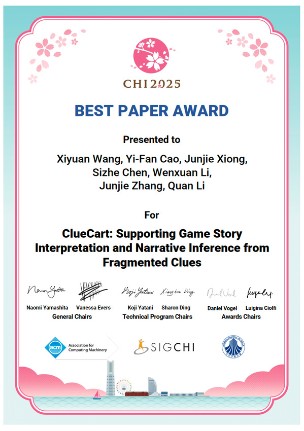近日,全球人机交互领域会议(ACM CHI 2025)在日本横滨召开。CHI(The ACM CHI Conference on Human Factors in Computing Systems)是全球人机交互领域最具影响力的标杆性学术会议之一,是中国计算机学会(CCF)认证的A类会议,并在Core Conference Ranking中位列A*级(Flagship Conference)。九游体育(www.jiuyou.com)官方网站信息科学与技术学院李权教授课题组的最新研究成果“ClueCart: Supporting Game Story Interpretation and Narrative Inference from Fragmented Clues”荣获最佳论文奖(Best Paper Award)。该研究成果由信息科学与技术学院李权课题组、香港科技大学跨学科学院及香港科技大学(广州)计算媒体与艺术系合作完成。信息科学与技术学院2022级硕士研究生王希元为论文的第一作者,李权教授为通讯作者。该工作聚焦于当前游戏叙事解析中的关键挑战,提出了名为ClueCart的人工智能工具,为玩家与内容创作者提供了全新的叙事分析解决方案。