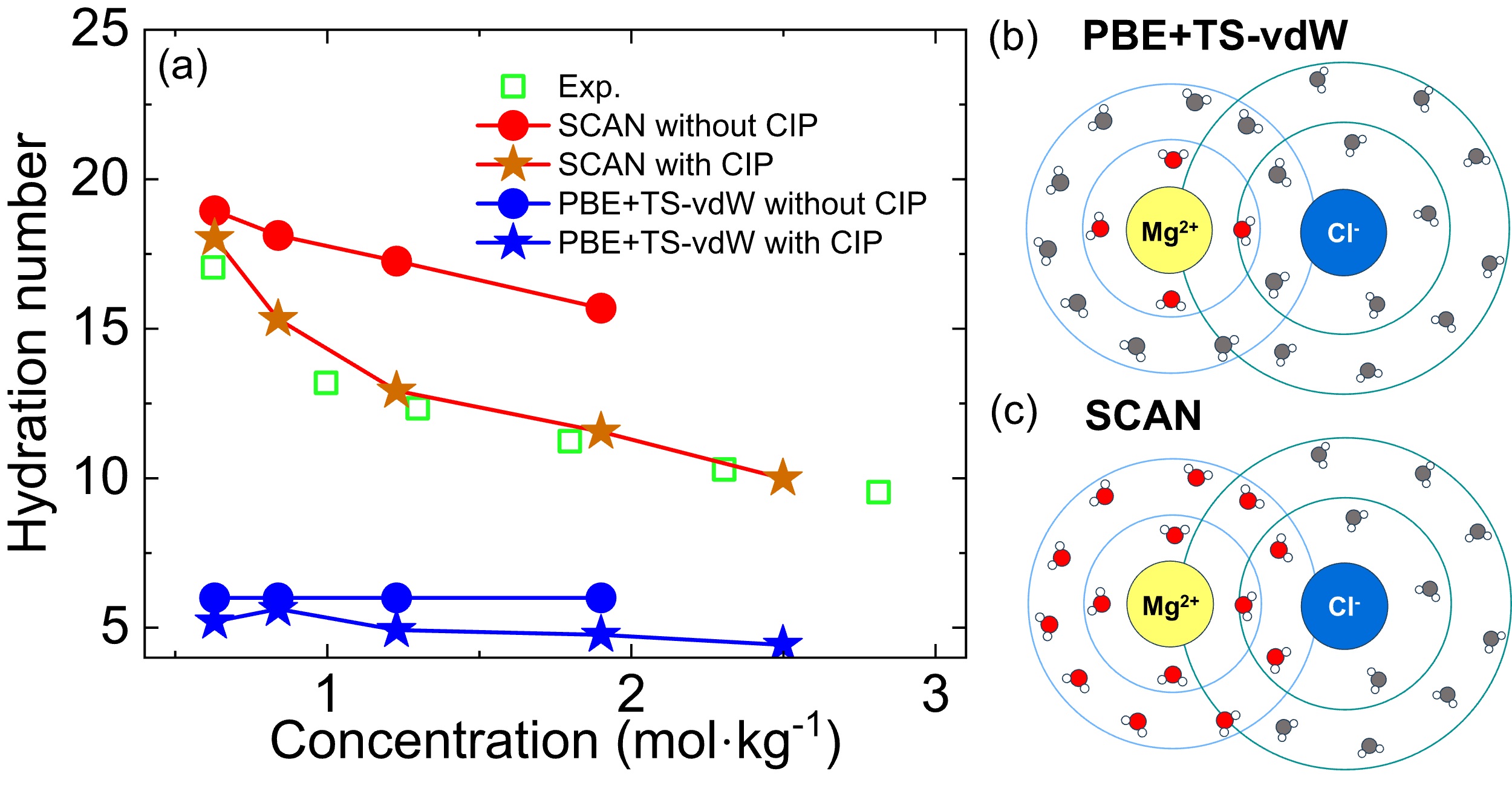 水合数浓度依赖机制——随着MgCl2浓度从0.17M增加至3.00 M,Cl-通过形成溶剂共享离子对(solvent-shared ion pairs,SSHIPs)侵入第二壳层,导致水合数从>6逐渐下降。SCAN的结果与实验观测趋势一致,而PBE+TS-vdW方法存在系统性偏差。这种偏差的根源在于两种泛函对于离子-水相互作用与氢键网络竞争关系的不同描述。