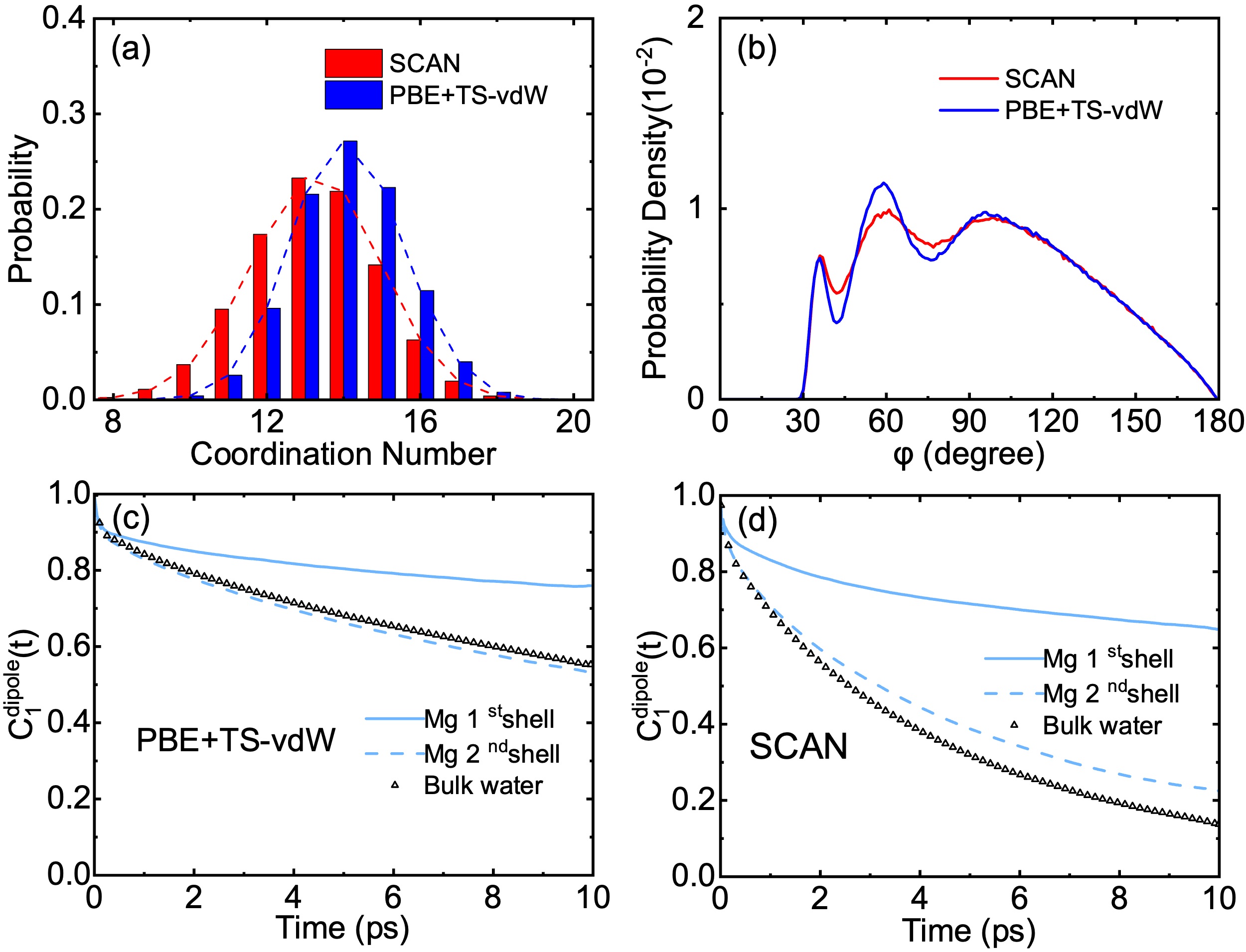 动力学迟滞效应——SCAN模拟显示,镁离子产生了对第二壳层水分子旋转动力学的显著迟滞效应(水分子偶极矩时间关联函数的衰减速度介于第一壳层与体相水之间),此现象在PBE+TS-vdW中因氢键主导而被掩盖。