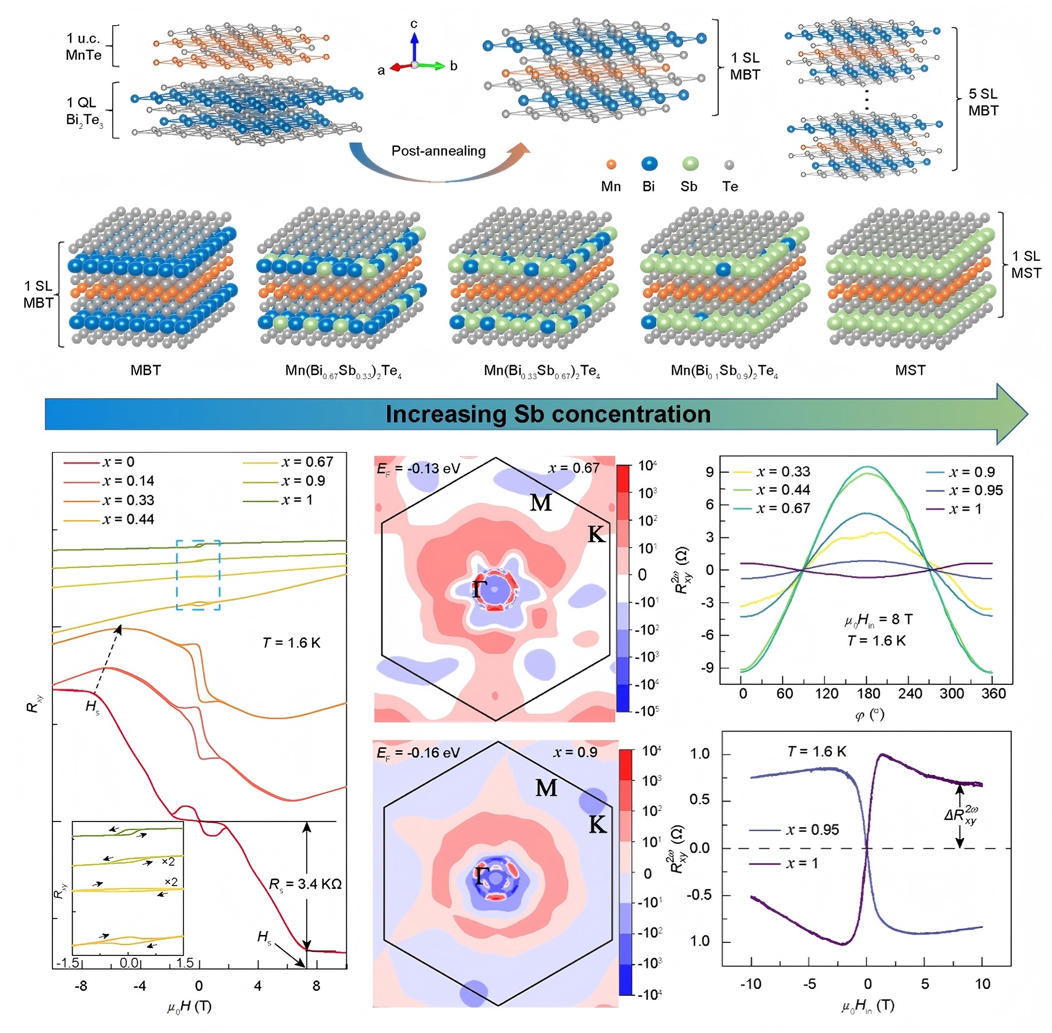 近年来,拓扑材料因其独特的量子特性在凝聚态物理和新型自旋电子器件中引起广泛关注。其中,Mn(Bi1-xSbx)2Te4 作为一种本征磁性拓扑绝缘体,因其兼具磁性与拓扑性,成为研究量子反常霍尔效应、自旋电子学以及能带工程的重要平台。在前期工作基础上,研究团队利用分子束外延生长技术制备了一系列高质量的2英寸Mn(Bi1-xSbx)2Te4薄膜。结合基于密度泛函理论的第一性原理计算,他们发现随着锑(Sb)掺杂比例的提高,Mn(Bi1-xSbx)2Te4的能带结构发生显著演化,诱导出一个从拓扑非平庸态向平庸态的拓扑相变,其对应的反常霍尔电导(anomalous Hall conductance,AHC)也会出现极性翻转。同时还观测到该材料体系的自旋纹理结构手性变化会诱导二次谐波霍尔响应信号的极性反转。本工作揭示了能带工程在实现本征磁性拓扑绝缘体材料电子能带结构,表面态自旋纹理以及拓扑物性调控方面的巨大潜力,不仅为探索非线性输运现象提供了理想模型,也为基于自旋手性和拓扑自由度的低功耗量子器件奠定了坚实基础。