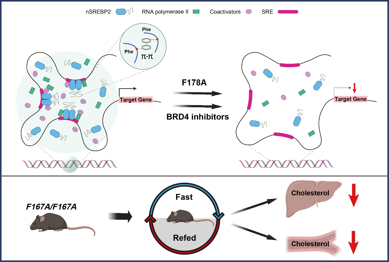 研究人员发现细胞缺乏胆固醇时,成熟的nSREBP2进入细胞核内通过相分离形成凝聚体,与RNA Pol II和BRD4等转录共激活因子相互作用在靶基因座处形成超级增强子,进而促进靶基因的转录激活。机制解析发现位于nSREBP2 N端无序区域(IDR-N)上的朊病毒样结构域2(Prion-like domain 2,PrLD2)是nSREBP2发生相分离形成凝聚体的关键氨基酸片段。通过进一步的截短和突变,发现第178位苯丙氨酸(F178)通过π-π相互作用驱动nSREBP2相分离的发生。F178A突变不仅破坏了nSREBP2凝聚体,也抑制了nSREBP2的转录活性,这一现象被FUS-IDR融合所回补。对应的该位点敲入纯和品系小鼠在禁食-再喂食实验中相对于野生型小鼠表现出更低的血液和肝脏胆固醇水平,显示其胆固醇合成上调受损。