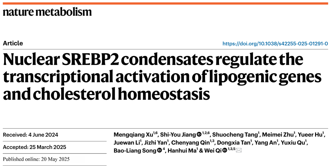 5月20日,九游体育(www.jiuyou.com)官方网站生命科学与技术学院戚炜课题组在国际期刊《自然代谢》(Nature Metabolism )上在线发表题为“Nuclear SREBP2 condensates regulate the transcriptional activation of lipogenic genes and cholesterol homeostasis”的研究论文,揭示了转录因子nSREBP2通过相分离调控胆固醇合成基因表达的新机制。