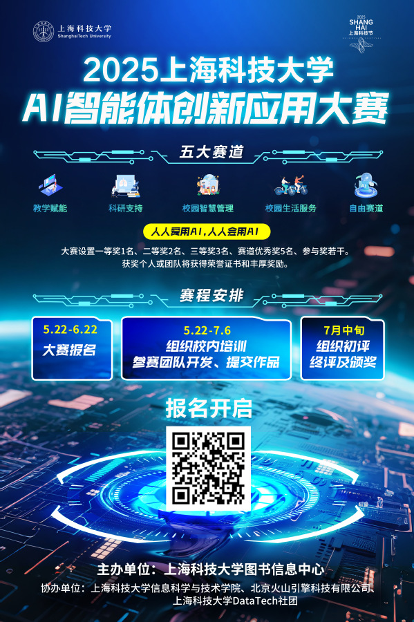 参赛选手于2025年6月22日前通过以下链接提交报名信息:https://wenjuan.shanghaitech.edu.cn/vm/QVS3Wlw.aspx
