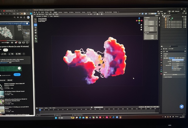 此外,我对前沿人工智能算法与生物科技相结合的交叉研究领域也充满着热情。大二期间,我与信息学院学生创业的AI for Science公司合作,设计开发了以AI为核心的蛋白质设计预测科研平台。在严谨的用户界面设计工作之外,我还基于团队设计的各种蛋白质结构发挥创意,通过三维渲染为团队制作了特别的品牌视觉化设计。