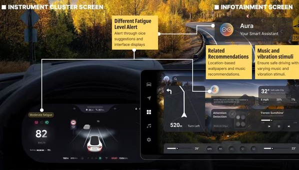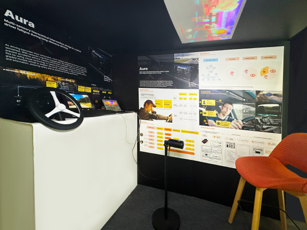 此外,学校与学院也提供了我们丰富的产学研资源,比如在“系统设计”这门综合设计课程中,学校与汽车企业APOLLO及德国汽车创新研发企业IDEENION公司合作推出结合课程与实习的创新设计项目。在每周的课程上,我们可以同时接受创艺学院教授和德国企业设计专家的联合授课与作品点评。最终,我所在的团队针对长途自驾游疲劳驾驶的场景设计出了结合视觉、听觉、触觉的分级唤醒方案,防止灾难性事故发生,同时提升驾驶体验。该项目成果最终荣获了2024美国缪斯设计奖(MUSE Design Awards)概念设计银奖。