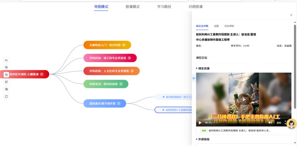 “小圕微课”以激活馆藏资源为核心,通过真实案例解析引导学生高效利用图书馆数据库与工具书;采用场景化教学将知识点融入论文写作、课题调研等实际科研场景,使抽象理论具象化;依托AI技术实现知识图谱可视化与个性化学习路径推荐,适配多学科需求。课程体系覆盖文献检索入门、学科资源探索、科研支持、数字创作等模块,以微视频、图文指南等形式满足师生从基础检索到AI创作的全链条需求,师生可通过虚拟教学社区与资源中心随时利用碎片化时间学习,实现“即学即用”的灵活提升。