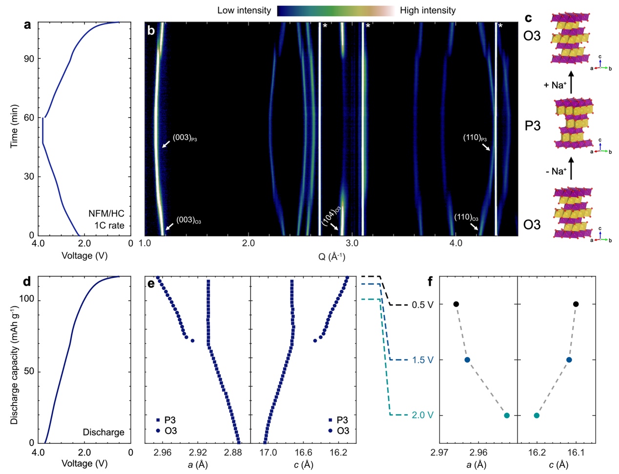 针对上述科学挑战,许超课题组深入探讨层状正极材料NaNi1/3Fe1/3Mn1/3O2(NFM)在低荷电态(SOC)下的相变。通过1C倍率下的原位同步辐射X射线衍射,发现低SOC下的O3-P3相变涉及层间滑移和显著的晶格失配,且随着放电深度(DOD)的增加,晶格失配加剧 (如图1所示)。这种相变导致严重的形态和界面退化,从而迅速降低性能,这一结论通过在不同DOD下循环电池得到了证实。