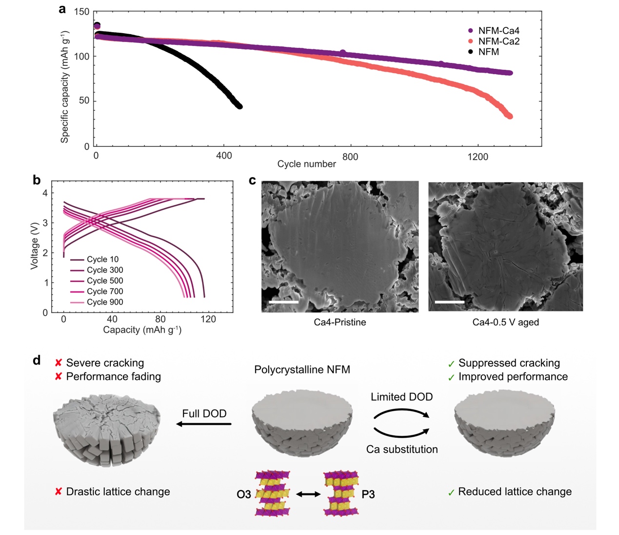 图2: Ca掺杂NFM正极改善电池性能及机理示意图。