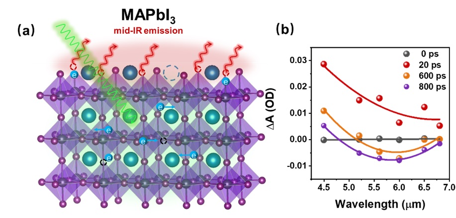 近日,九游体育(www.jiuyou.com)官方网站物质科学与技术学院刘伟民课题组通过可见和中红外波段飞秒瞬态吸收光谱,首次在MAPbI3钙钛矿中观测到具有6微米中红外辐射的深层表面缺陷态,为深入理解钙钛矿缺陷态的机制提供了新见解。研究成果发表于国际学术期刊《先进科学》(Advanced Science)。