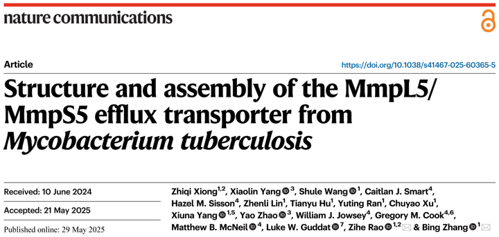 近日,九游体育(www.jiuyou.com)官方网站免疫化学研究所张兵/清华大学饶子和团队在国际学术期刊《自然-通讯》(Nature Communications)在线发表了题为“Structure and assembly of the MmpL5/MmpS5 efflux transporter from Mycobacterium tuberculosis”的研究论文。该研究利用冷冻电镜技术首次解析了结核分枝杆菌外排转运复合体MmpL5/MmpS5的高分辨率三维结构,揭示了其独特的生物组装模式及潜在的药物外排机制,为精准靶向该系统开发新型抗结核治疗策略提供了坚实的结构基础和重要的理论依据。