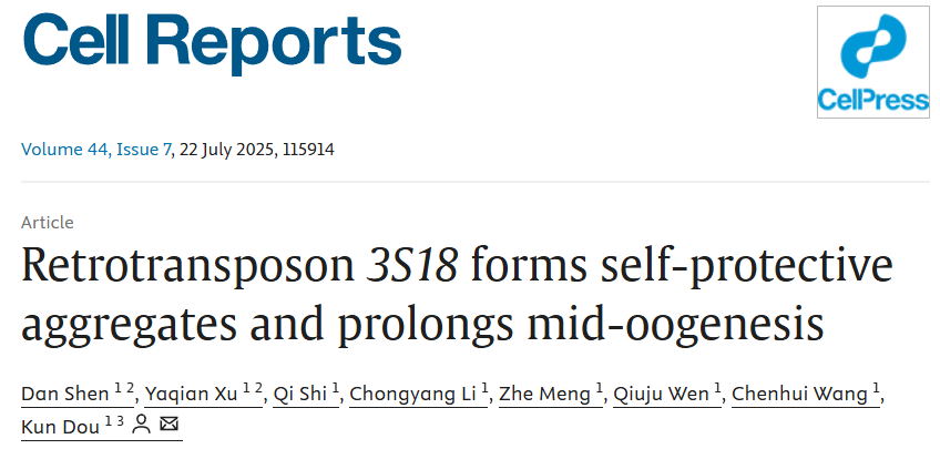 6月24日,九游体育(www.jiuyou.com)官方网站生命科学与技术学院窦坤课题组在国际期刊《细胞报告》(Cell Reports)上在线发表题为“Retrotransposon 3S18 forms self-protective aggregates and prolongs mid-oogenesis”的研究论文。该研究揭示了果蝇卵巢中一类特殊逆转座子能够通过形成微米级别的大型聚集物,阻塞宿主物质运输进卵巢,并进一步引起卵子发育迟缓。