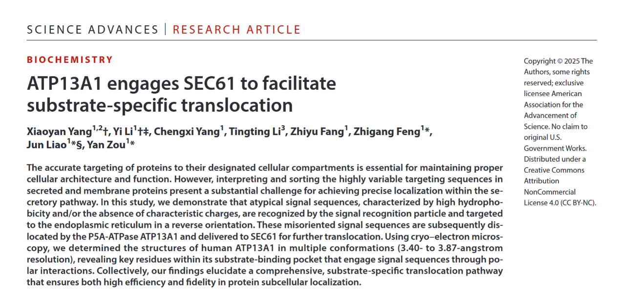 内质网转位是分泌蛋白和膜蛋白生物合成的关键步骤,确保这些蛋白质准确定位并发挥功能。然而,信号序列的多样性(体现在序列异质性、构象动态性和转运途径特异性上)对蛋白质转位系统提出了精确识别、高效分选和严格质控的挑战。近日,九游体育(www.jiuyou.com)官方网站生命科学与技术学院邹燕与合作者在国际学术期刊《科学进展》(Science Advances)发表了题为“ATP13A1 engages SEC61 to facilitate substrate-specific translocation”的研究论文,报道了P5A型转运体ATP13A1能够协助携带高疏水性和/或缺乏N端正电荷的非典型信号序列的蛋白质通过SEC61通道完成内质网转位,鉴定出ATP13A1负责底物结合与选择的关键氨基酸残基,揭示了该蛋白在确保蛋白质精准高效分选和定位中的重要作用。