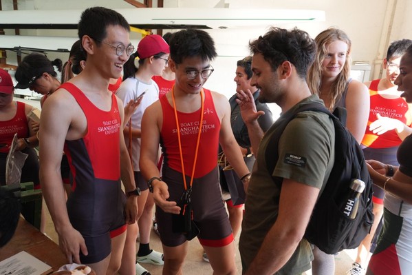图5:上科大赛艇队王一博(中)与牛津队员(右)交流