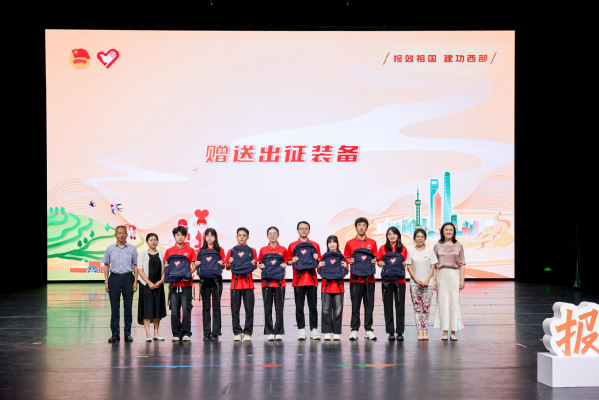 上科大校西部计划志愿者顾倩和张浩南作为代表,郑重接过了象征责任与期望的出征赠礼。这份礼物,承载着组织的关怀与嘱托,更激励着他们勇毅前行。