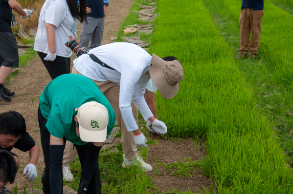 同学们参加田间除草劳动。看似简单劳动,却十分耗费体力。