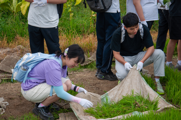 同学们学习抛秧。抛秧的动作类似扔毽子,秧苗底部裹着的泥土帮助秧苗更容易竖直着地。