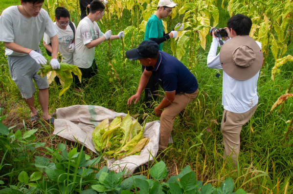 在村民指导下,同学们尝试摘烟叶。