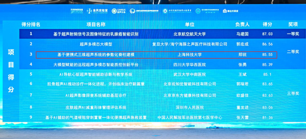 上科大信息科学与技术学院郑锐教授团队首次参赛,凭借项目《基于便携式三维超声系统的参数化脊柱建模》,顺利晋级总决赛并获得全国二等奖(总分第三)的优异成绩。