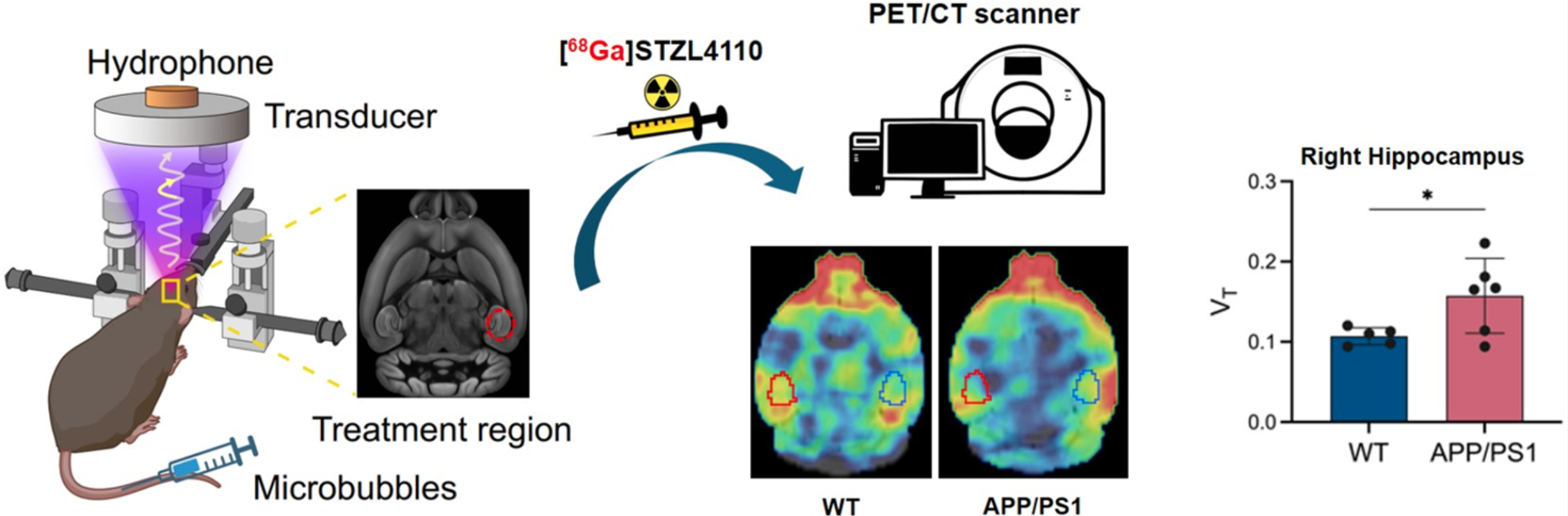 图1:FUS介导的Ga-68放射性显像剂在AD动物模型中的应用