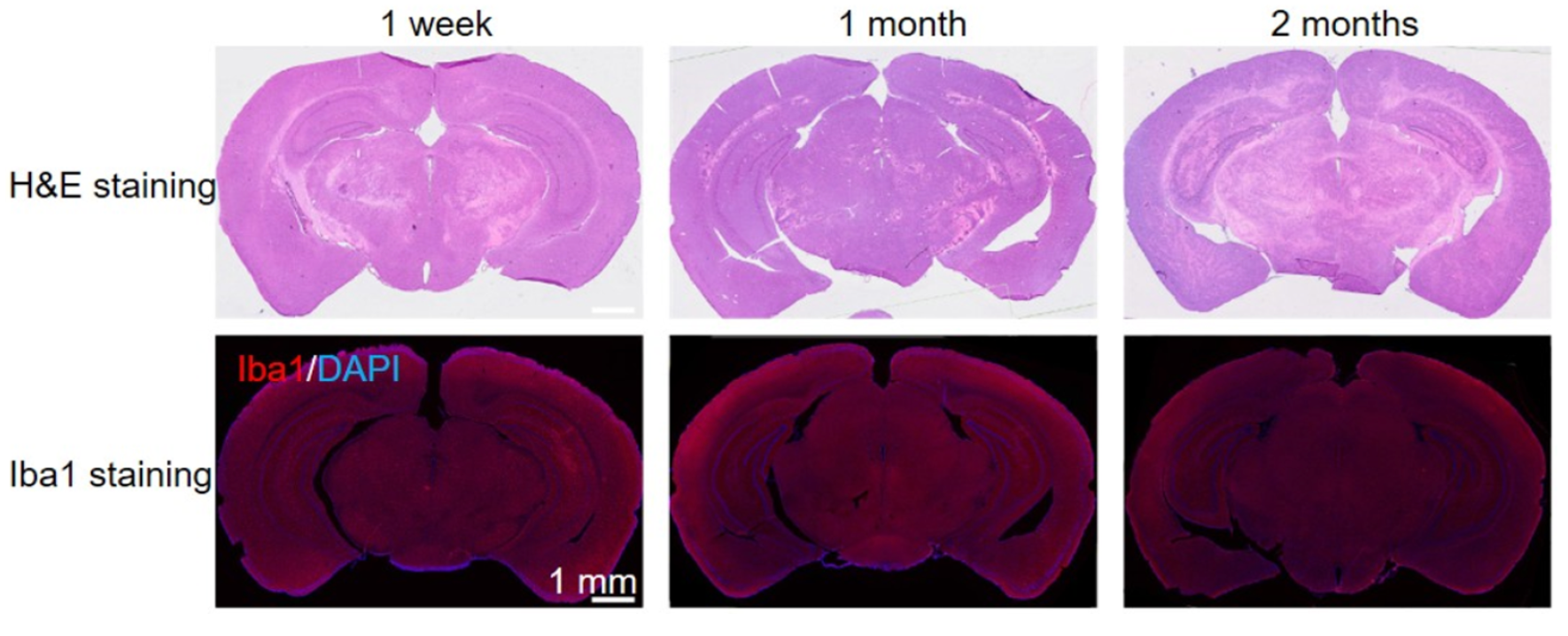 为解决这一难题,联合团队利用FUS联合微泡对血脑屏障进行定点(海马组织)可逆开放,实现了新型Ga-68标记β-淀粉样蛋白结合探针, [68Ga]STZL4110,高效进入脑组织并显像。PET成像结果显示,在AD模型小鼠中,FUS处理使右海马的放射性显像剂摄取量相比未处理侧提高了74%,显著增强了β-淀粉样蛋白的显像对比度(见图2)。组织学和免疫染色结果表明,该方法安全可靠,不会引发明显的炎症反应或组织损伤(见图3)。