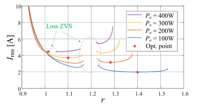 基于该建模框架,团队设计了一种优化调制策略,实现在全负载范围内开关器件的软开通,并最小化导通损耗与电流应力。在功率输出从100 W至400 W、功率增益比例从0.8至1.2的全工况条件下,系统均可实现ZVS开通,且所有MOSFET均处于低应力、高效率的工作状态。