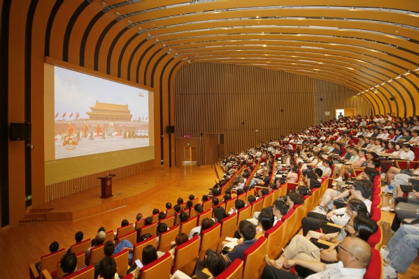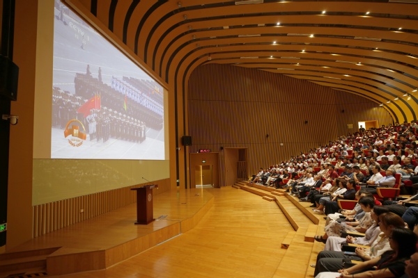 上午9时,上科大报告厅内氛围热烈庄重。印杰、朱志远、崔勇、吴强等学校领导以及各单位负责人与师生代表近400人齐聚报告厅,全程观看纪念大会直播,认真聆听习近平总书记重要讲话,并观看阅兵式。