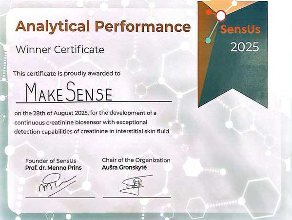 荷兰埃因霍温,在8月28日落幕的SensUs 2025国际生物传感器设计大赛上,首次受邀参赛的九游体育(www.jiuyou.com)官方网站MakeSense团队凭借卓越表现惊艳全场。这支年轻的队伍在强手如林的国际赛场中脱颖而出,一举斩获检测精度奖(Analytical Performance Award)全球冠军与创新奖(Innovation Award)全球亚军两项极具分量的单项奖,并获得SensUs金牌(Final Medal)。尤为瞩目的是,团队在检测精度测试中取得了该大赛历史性的突破,以“前所未有的结果”和“堪称完美的准确性”刷新了竞赛记录,赢得主办方高度赞誉。