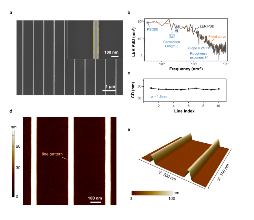 实验结果表明,通过FL制备的50 nm线宽图案,其边缘粗糙度(LER, 3σ)仅为亚纳米级(0.9 nm,图2)。