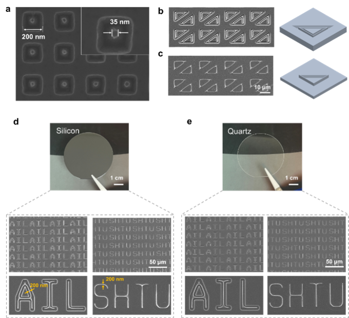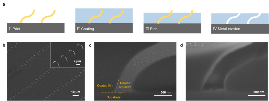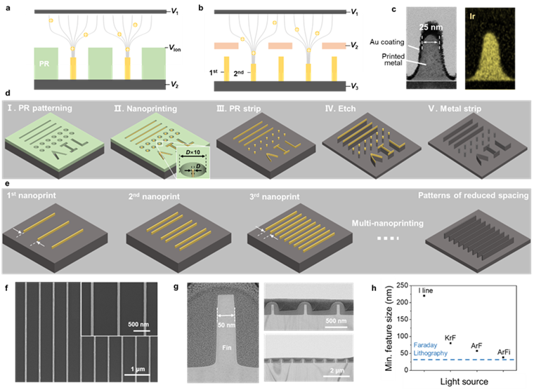 冯继成课题组使用自研的法拉第3D打印技术(Faraday 3D printing),利用其电场本征的聚焦能力,将原图案特征尺寸缩小至少十倍,然后将所打印的金属纳米结构作为硬掩膜进一步刻蚀,获得了基于硅片和石英基底的高质量图案(图1)。因该技术首先通过法拉第3D打印进行纳米结构的硬掩模制造,然后通过刻蚀基底材料获得图案,故延续了法拉第3D打印的命名方式,将该加工方式命名为Faraday lithography(FL,法拉第转印),该工作中展示了35 nm的加工精度(注:目前主流光刻手段分辨率:DUVL–38 nm, EUVL–8 nm, EBL–8 nm)。