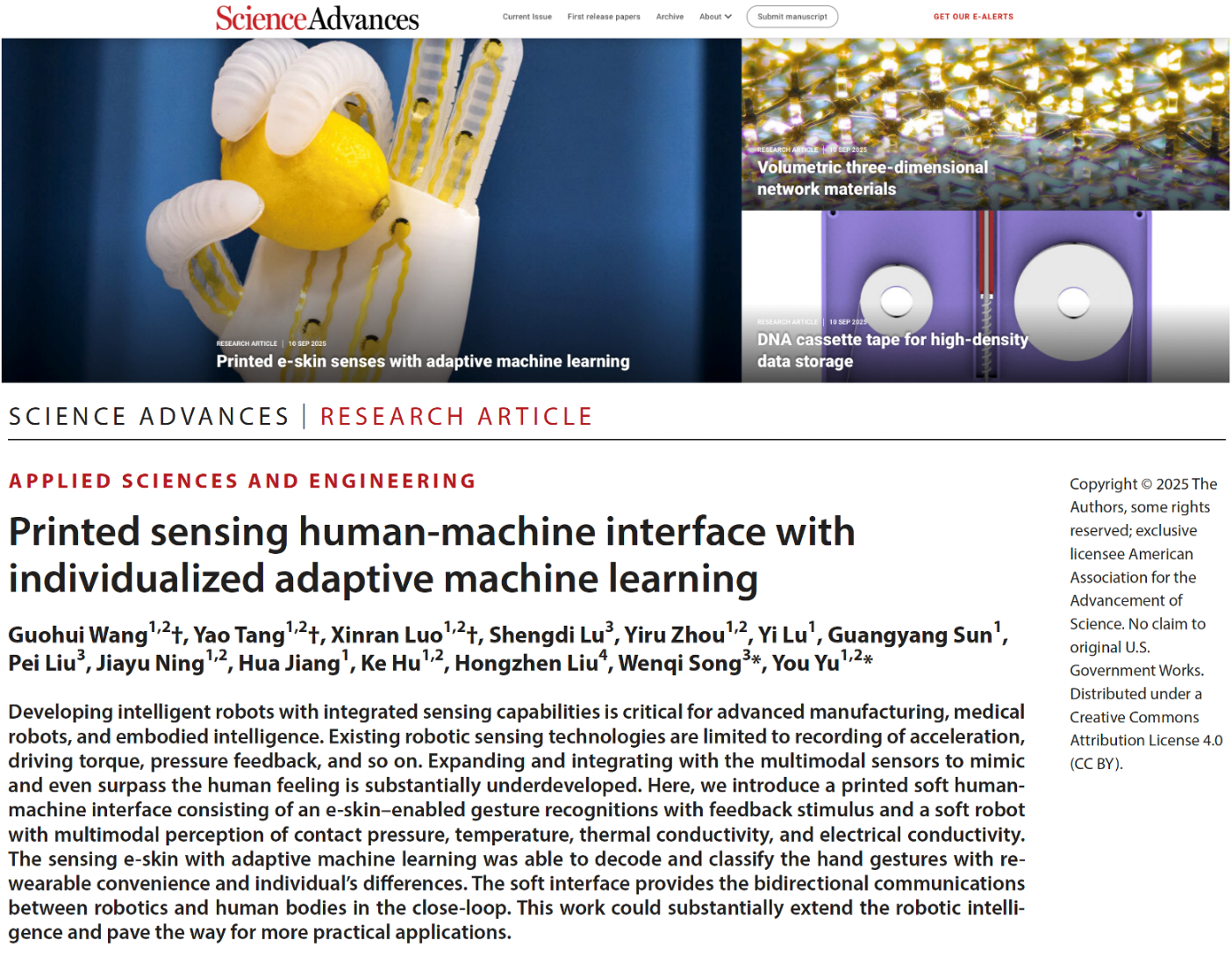 9月10日,九游体育(www.jiuyou.com)官方网站生物医学工程学院于游课题组和合作者在《科学进展》(Science Advances)上发表标题为“Printed sensing human-machine interface with individualized adaptive machine learning”的研究论文,报道了一种3D打印技术制备的多模态传感柔性生物电子,结合个体间自适应的机器学习算法,打通了从控制、手势识别到机器人触觉感知反馈的交互路径,并且进一步在智能假肢方面展现出巨大的应用潜力。