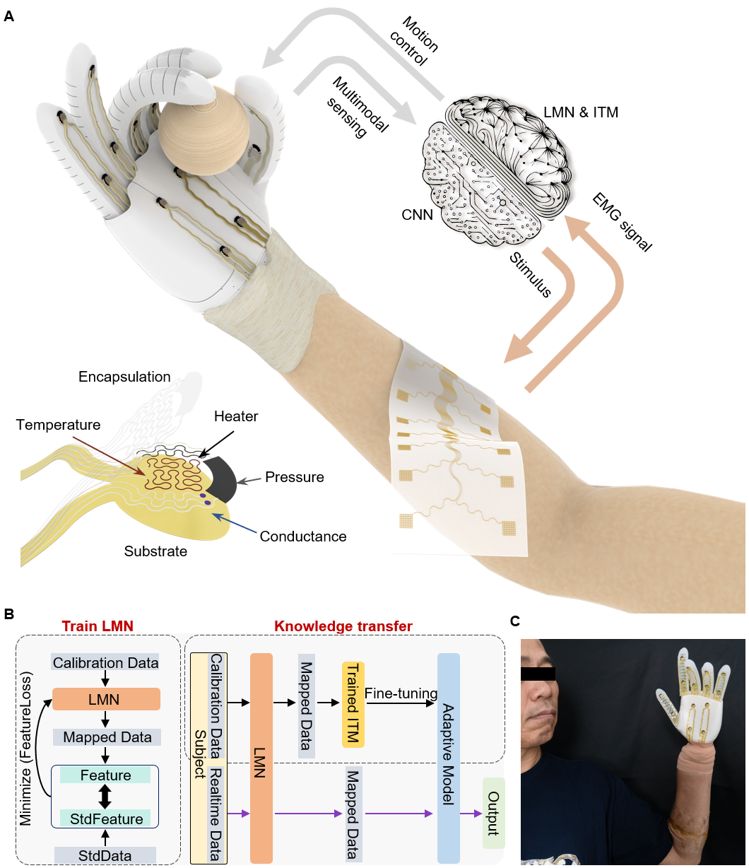 图1,(A)双向信息采集和交互的柔性传感生物电子示意图;(B)自适应机器学习算法实现低样本量迁移学习并完成模型的个性化适配;(C)智能假肢在前臂截肢者的实际应用。