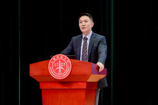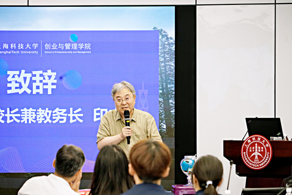 常务副校长兼教务长印杰为新生致辞。他介绍了上科大成立创管学院的初衷与定位——依托学校的硬科技资源,搭建科技成果与市场转化的桥梁,培养面向产业创新的高层次应用型人才。他鼓励同学们将所学知识与科技前沿深度融合,关注国家“卡脖子”领域发展,围绕社会实际问题探索跨学科解决办法,服务于国家发展与时代需求。