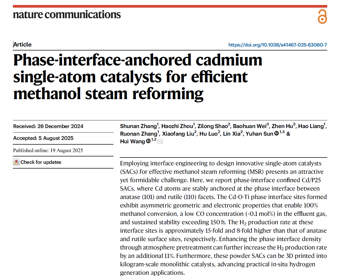 论文标题:Phase-interface-anchored cadmium single-atom catalysts for efficient methanol steam reforming
