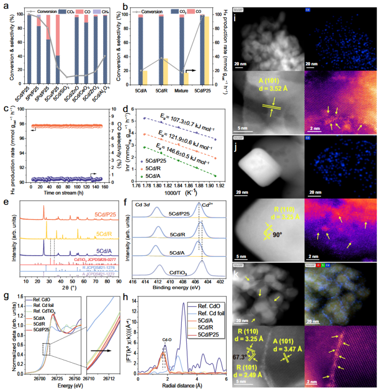 针对以上问题,团队基于前期CO2加氢制高附加值化学品以及MSR纳米颗粒催化剂的研制基础,成功制备出相界面受限的单原子催化剂,Cd原子稳定锚定在锐钛矿(101)和金红石(110)面的相界面处,形成的Cd-O-Ti相界面位点具有独特性质,展现出优异的甲醇蒸汽重整性能。