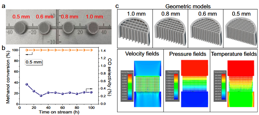 研究发现,与其他金属相比,由于Cd与P25二氧化钛相界面具有能量适配性,Cd原子可稳定锚定于P25的锐钛矿(101)-金红石(110)相界面缺陷处,形成具有不对称几何与电子特性的Cd-O-Ti相界面位点。这一独特结构增强了电子转移及反应物的吸附活化能力,使得其氢气产率分别是锐钛矿和金红石表面单原子位点的15倍与8倍,同时实现了100%甲醇转化率、超低CO浓度(~0.1 mol%)及超150小时的稳定性(图1)。通过H₂、N₂等气氛预处理,可实现相界面位点密度的调控。其中,经H2预处理后,相界面密度最高可达10.1 m² g⁻¹,氢气产率进一步提升11%,达到292.9 mmol・g⁻¹・h⁻¹。结合原位红外、动力学同位素效应及理论计算等表征手段,证实反应遵循甲酸盐分解路径,相界面位点显著降低了甲酸盐形成及H₂O吸附解离的能垒,同时抑制CO生成,解释了其优异性能的成因。此外,该粉末催化剂可通过3D打印制成千克级多孔整体式催化剂,进一步优化反应过程中的传质与传热效率,使CO浓度降至0.07 mol%(图2)。