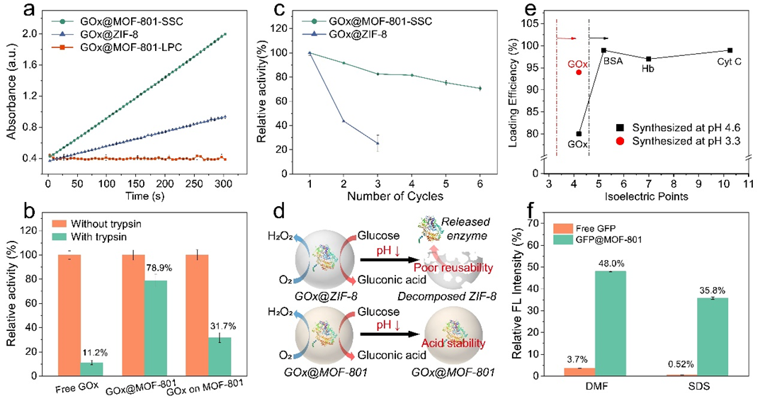 图2.样品的活性和稳定性测试以及MOF包覆蛋白质机理探究。