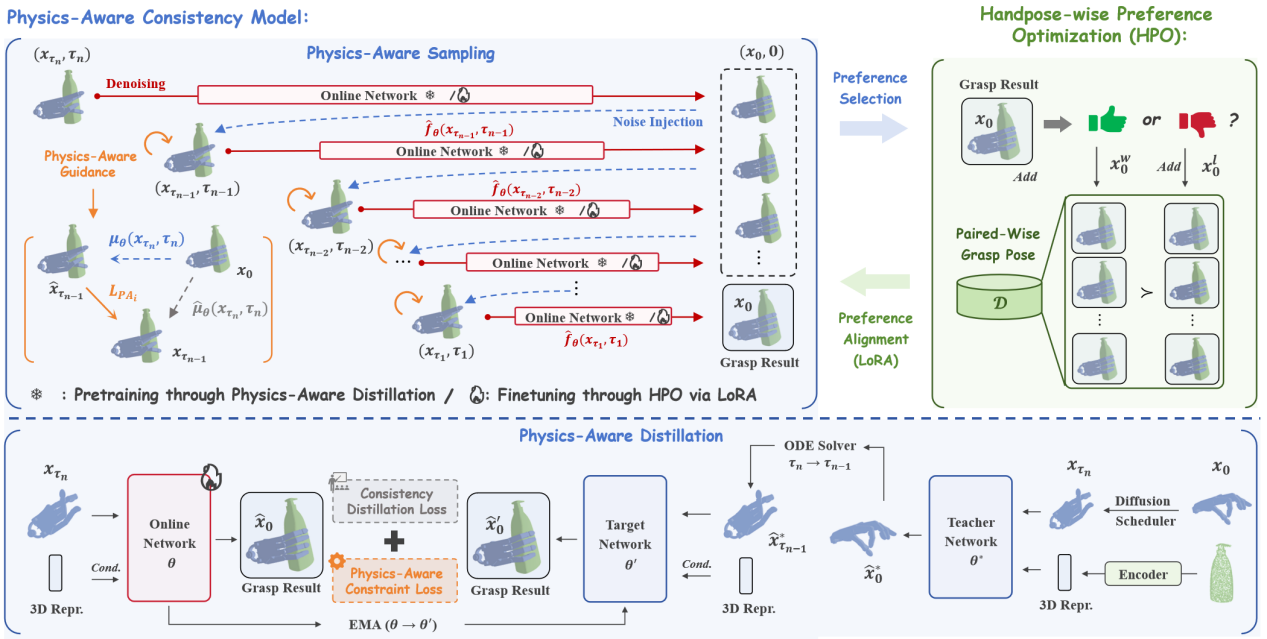 具备自主进化能力、能够越抓越稳的灵巧手,是实现通用具身智能进化道路上的关键突破。面对真实世界中近乎无限的物体形态和抓取场景,EvolvingGrasp 首次提出“进化式抓取生成”框架:通过Handpose-wise Preference Optimization(HPO)方法,使机械手能够以仿生方式从成功与失败的抓取中持续学习;进一步结合 Physics-Aware Consistency Model,将扩散模型蒸馏为仅需 2~4 步推理的极速采样器,在实现30倍推理加速的同时严格保证抓取的物理可行性。该方法在四个公开数据集上均达到最先进性能,并在ShadowHand真实机器人平台上验证了其在线微调能力,展现出“越抓越好”的进化特性。
