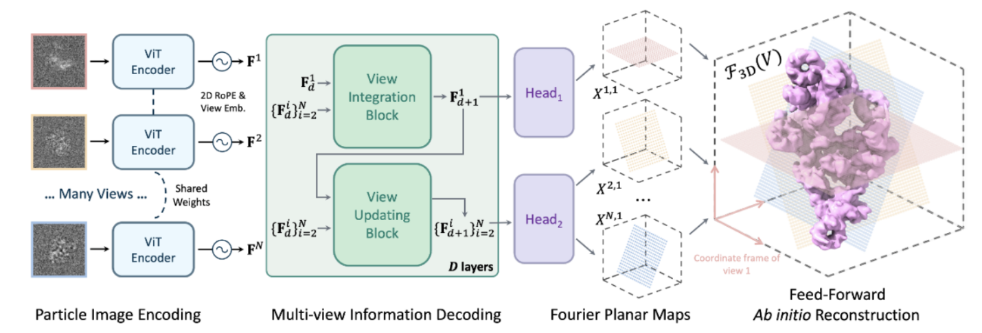 从无序图像中估计姿态是三维重建、机器人技术与科学成像中的一个基础性问题,在冷冻电子显微镜(cryo-EM)等科学成像领域,从无序粒子图像中恢复姿态并进行三维重建,目前仍依赖于耗时的迭代优化流程,主要是由于极低的信噪比(SNR)和对比度传递函数(CTF)所引入的图像畸变等挑战。研究提出了CryoFastAR,首个专用于 cryo-EM 的几何基础模型,能够直接从带噪声的 cryo-EM 图像中预测粒子姿态,实现快速的 ab initio 三维重构。实验结果表明,CryoFastAR 在合成与真实数据集上均达到了与传统迭代方法相当的重构质量,同时推理速度显著提升。