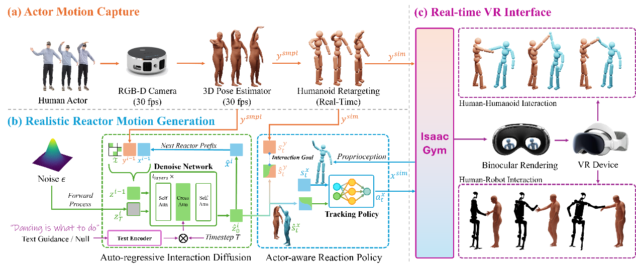 当前人机交互研究中,现有方法往往难以在保持实时响应、物理合理性与交互同步性的同时,实现人-虚拟角色、人形实体或机器人之间的高质量互动。此类“响应延迟”与“物理不一致”问题会显著降低用户体验并影响系统安全性。为此,研究团队提出了一种统一的实时交互合成框架 Human-X。该方法在 Inter-X 和 InterHuman 等多个人-人交互数据集上进行了全面验证,其性能明显优于当前主流方法,在VR/AR、社交机器人、数字人交互等沉浸式人机协同场景中展现出广泛的应用潜力。
