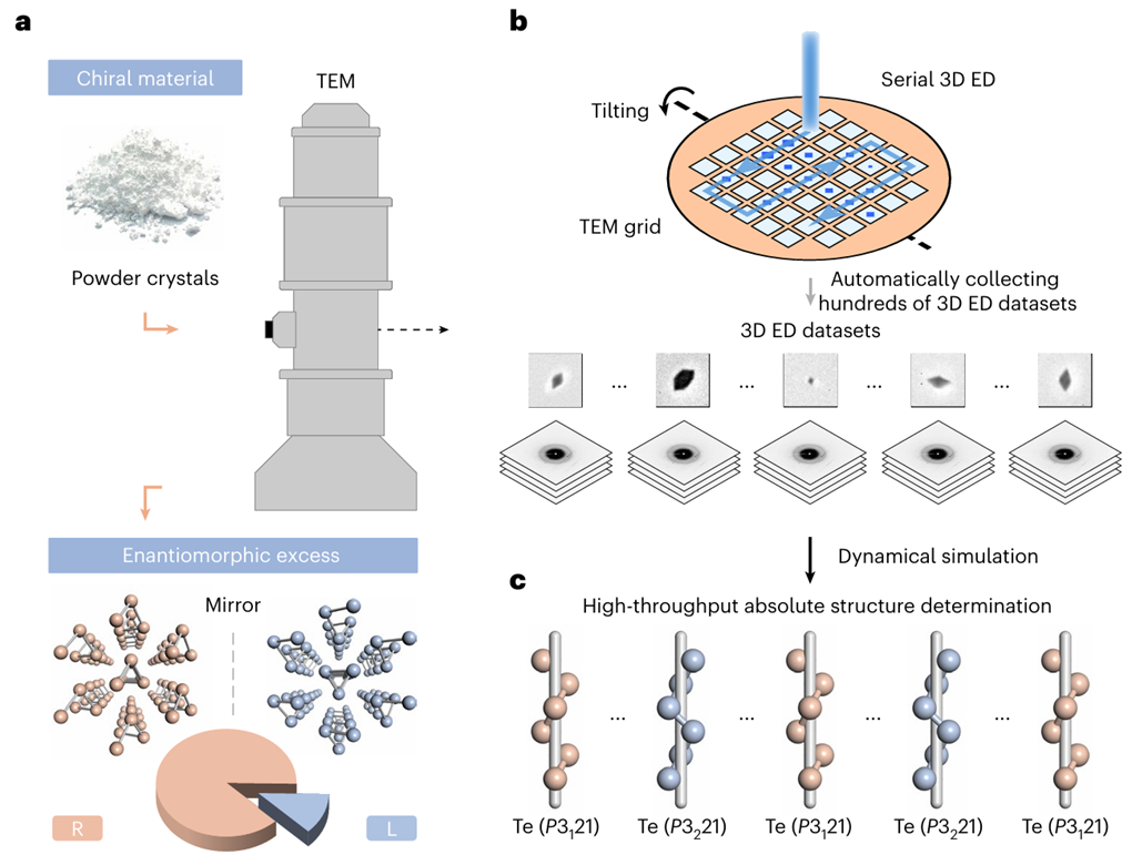 本工作提出了一种自动串行三维电子衍射(serial 3D ED)方法,并结合自主研发的电子衍射强度模拟技术,实现了对晶态粉末材料的物相鉴定与手性分析(图1)。该方法包括两个核心步骤:(1)serial 3D ED自动化数据采集,在TEM载网上自动定位大量晶体,并依次获取其形貌与衍射信息;可在数小时内完成数百套单晶衍射数据的采集,实现对粉末样品的全面采样。(2)高通量绝对结构测定,基于单晶电子衍射数据进行晶体结构解析和运动学精修,并结合动力学模拟,实现对每个晶体手性的准确测定;进一步将判定结果与晶体形貌相结合,即可完成对粉末样品的对映体组成的定量分析。