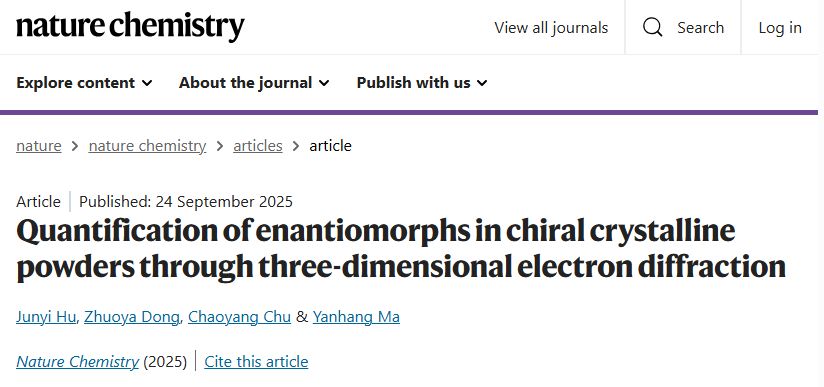 手性材料因其独特的结构,在对映选择性合成、不对称催化、手性光学器件及手性药物研发等领域发挥重要作用,如何高效而精准地分析手性晶相的组成是理解和调控其性能的关键。近日,九游体育(www.jiuyou.com)官方网站物质科学与技术学院马延航团队提出了兼具定性与定量的手性晶体粉末高通量分析方法。相关成果以“Quantification of enantiomorphs in chiral crystalline powders through three-dimensional electron diffraction”为题,发表在国际学术期刊《自然-化学》(Nature Chemistry)。
