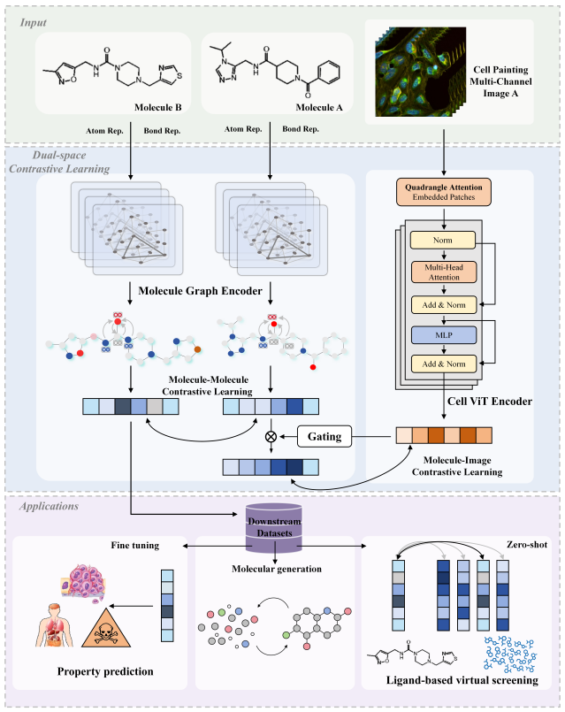 针对上述挑战,合作团队开发了名为PhenoModel的多模态药物设计基座模型,创新性引入“双空间对比学习”策略,高效对齐并融合分子结构与细胞表型两类信息,以提升模型对分子的表征能力(图1)。在分子属性建模、基于靶标与基于表型的虚拟筛选等任务中,均表现出显著优势。在此基础上,团队进一步发展了名为PhenoScreen的基于表型微扰的活性化合物筛选技术:该方法能够准确预测化合物—细胞表型微扰特征,并以已知活性化合物为桥梁,帮助研究者发现兼具用户指定表型且活性可与参考化合物相当或更优的全新候选分子。