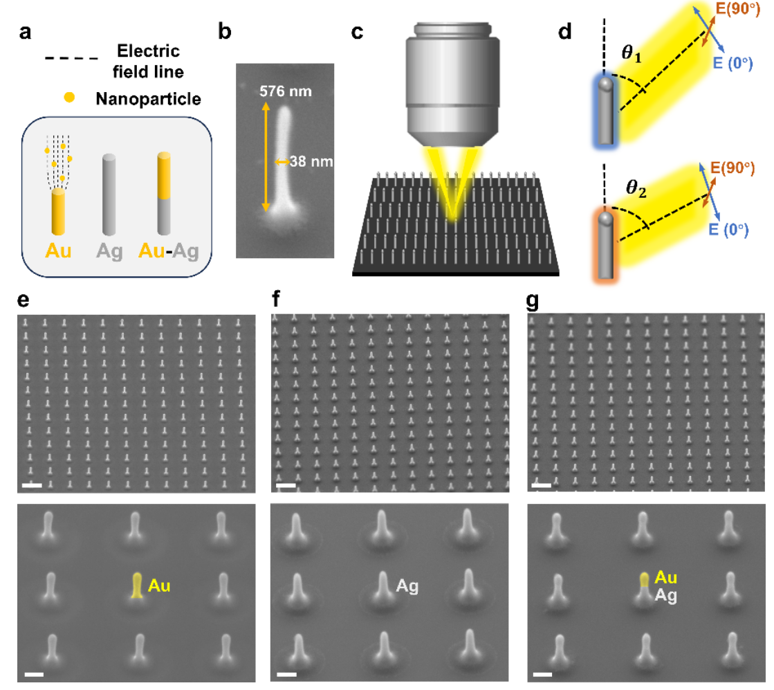 传统纳米天线大多为平面结构,就像平铺在基板上的图案,限制了其对光场的调控能力。冯继成团队开发的法拉第3D打印技术,犹如一支看不见的电场画笔,能够将金、银等金属纳米粒子绘制成立体结构。这些纳米天线直径仅约40纳米,高度却能达到直径的15倍以上,像一片密集的纳米森林(图1)。