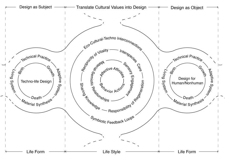 针对上述挑战,邹悦课题组基于关系性设计哲学,深入探讨人工智能在个体生命叙事以及社会、生态多维关系中的角色,提出“关系性技术生命设计”框架——一种融合关系性体验、知识共享与人机共生理念的设计新方法,旨在将人工智能重新定义为社会物质网络和广泛生态系统中的共同构成主体。该框架强调在设计过程中重视人类与AI之间的情感连接、知识分享与文化意义的协同生成,推动AI从“工具”角色向“生命体”伙伴转变。